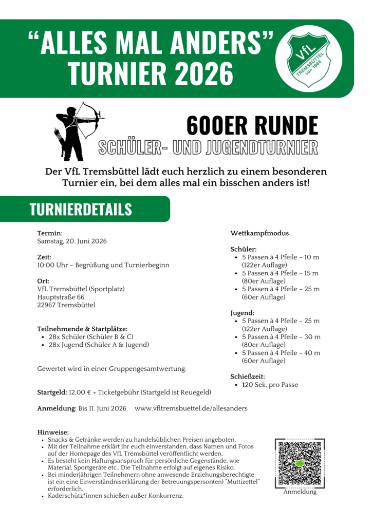 Der VfL Tremsbüttel lädt alle jungen Bogensportbegeisterten zu einem ganz besonderen Wettkampf ein: Beim „Alles mal anders“ Turnier 2026 erwartet euch ein spannendes Format, bei dem der Name Programm ist.
