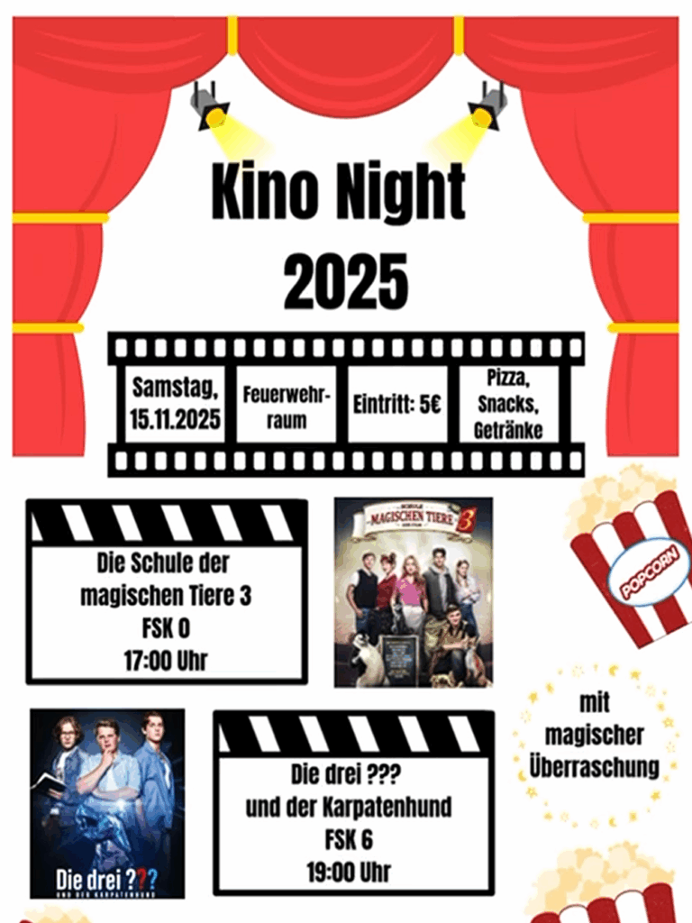 Für das leibliche Wohl ist wieder bestens gesorgt: Pizza, Snacks und frisches Popcorn warten auf euch. Der Eintritt beträgt 5 Euro pro Person.